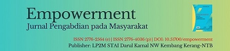 Empowerment : Jurnal Pengabdian pada Masyarakat terdaftar di BRIN dengan ISSN 2776-2564 (Online), ISSN 2776-4036 (Print) dikelola oleh LP2M STAI Darul Kamal NW Kembang Kerang-NTB. Jurnal ini adalah peer-reviewed journal yang memuat artikel-artikel ilmiah dari berbagai disiplin ilmu yang diadopsi dalam berbagai aktivitas pengabdian kepada masyarakat berbasis Participative Action Research (PAR) dan penelitian terapan lainnya. Artikel-artikel yang dipublikasikan meliputi hasil-hasil penelitian ilmiah asli, artikel ulasan ilmiah yang bersifat baru, atau komentar atau kritik terhadap tulisan yang ada dimuat tentang tema-tema penelitian pengabdian pada masyarakat meliputi, Pendidikan dan Kependidikan, Sosial budaya, Sains dan Teknologi, Bahasa dan Seni, Bisnis dan Ekonomi, Manajemen dan Organisasi dan Agama dan budaya Masyarakat.